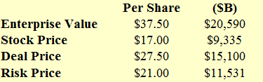 The “enterprise value” is commonly cited and it is the total debt ($11.3 billion) plus the market value ($9.3 billion) in this case, and works out to $37.50 per share which is a significant premium to both the stock price ($17) and the deal price ($27.50).