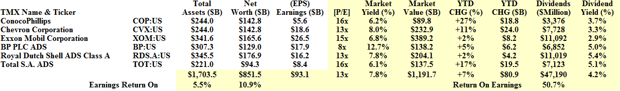 For example, the stock market value of the six companies in “big oil” (we’ve included ConocoPhillips) is $1.2 trillion and up $81 billion this year for an average gain of +7%. They also earned $93 billion and paid $47 billion in dividends to their shareholders for a return on earnings of 50% and an average yield of 4.2%.