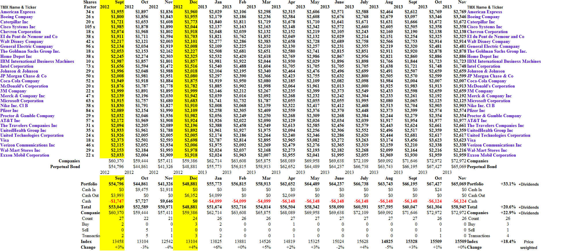 Exhibit 2: (B)(N) Dow Jones Industrial Companies – Prices & Portfolio – November 2013
