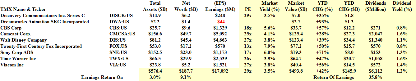 Deal Book. It’s been a banner year for the US motion picture industry. On revenues of $290 billion, it’s produced earnings of $17 billion of which $6.1 billion or 36% has been returned to the shareholders for a current yield of 1.2%. But there’s more. The aggregate market value is $490 billion and up from $350 billion last year and $280 billion the year before for a portfolio gain of +42% this year and +25% the year before. Please see the Insert and Exhibit 1 below.