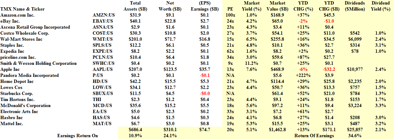 Moreover, the marketing juggernaut, Amazon.com, is barely earning a living (net $133 million), doesn’t pay dividends, and its stock price is up +37% this year for an increase in “market value” of $45.3 billion.