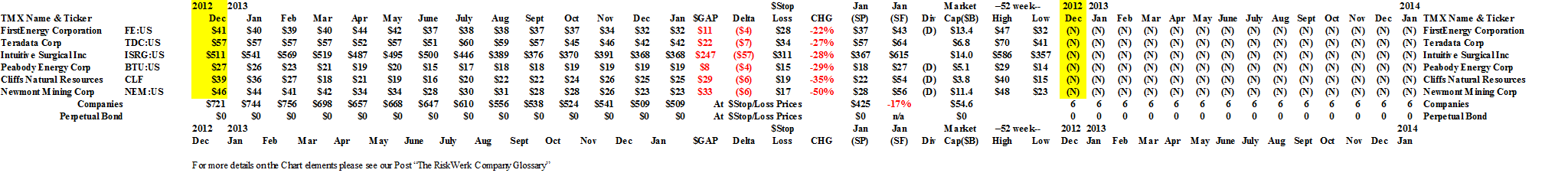 Drama. Although the market was up more than +27% last year, only about half of the companies in the S&P 500 made that mark and among the biggest losers were FirstEnergy Corporation (-22%), Intuitive Surgical Incorporated (-28%), Peabody Energy Corporation (-29%), Teradata Corporation (-33%), Cliffs Natural Resources (-35%) and the winner in the race for the bottom is one of the world’s largest gold and copper producers Newmont Mining Corporation (-50%).