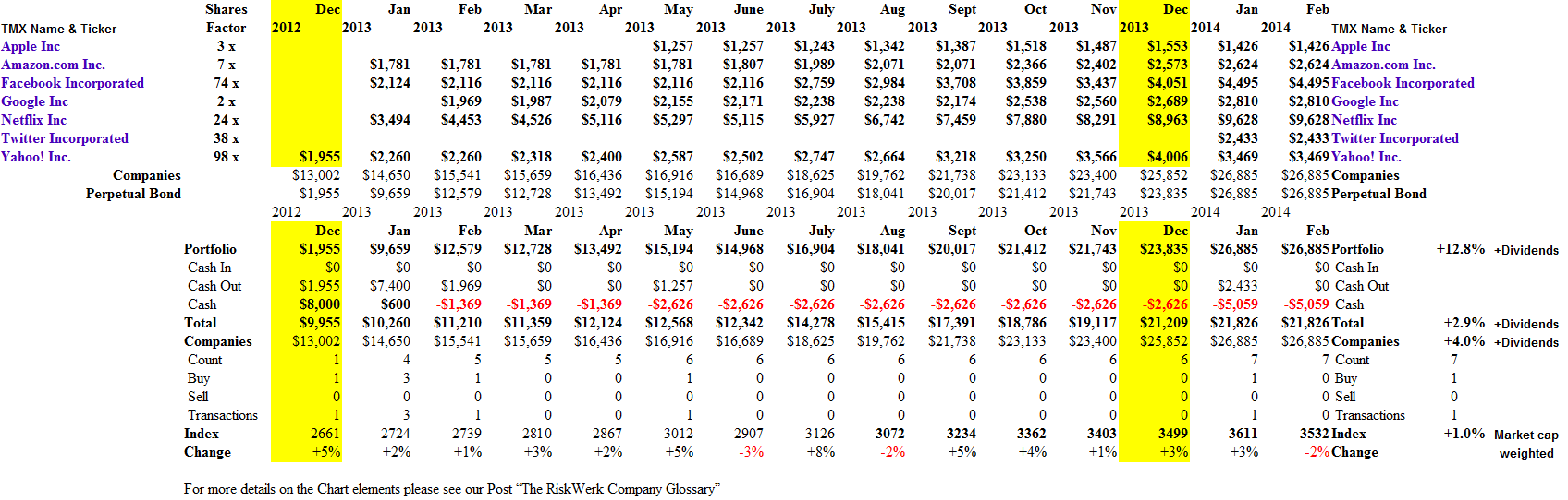 We, therefore, have no idea whether the investors will give another $300 billion to the companies this year. Nevertheless, all seven of the companies are in the Perpetual Bond™ which returned +110% on them last year and our estimate of the downside in the portfolio due to the demonstrated volatility is minus (11%) absent some new surprise. In either case – unlike the future which has no precedent – we know what to do because we know where we are relative to the “price of risk“.