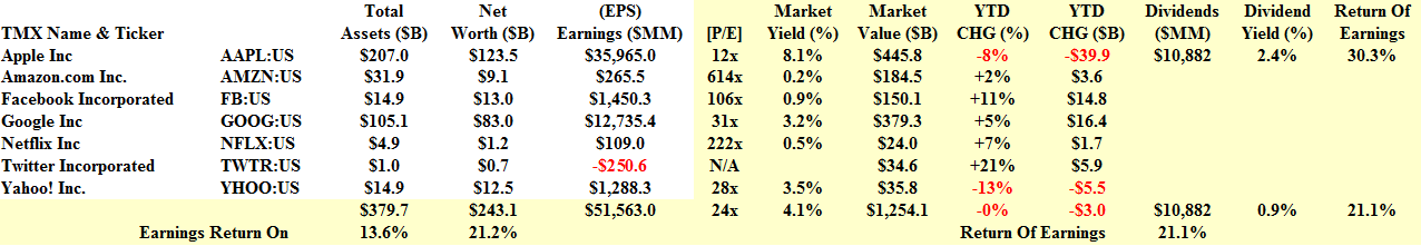Only Apple Incorporated pays a dividend and the aggregate payout was $11 billion for a 21% return of earnings (which were $53 billion last year) and an aggregate dividend yield of less than 1%. Obviously, they are not big on sharing and we have to wonder how investors will get their money back if not from each other.