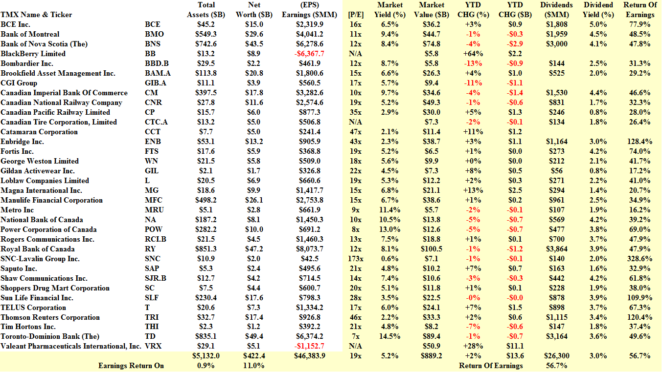 Drama. Canada doesn’t think of itself as a “3rd world” nation or emerging economy but the reality of it is quite different and “bracing”. For example, last year, the top sixty Canadian companies in the S&P TSX earned $52 billion and paid 75% of it, $40 billion, in dividends and most of that, perhaps as much as 80% of it, is going to be paid, and most likely “exported”, to the foreign owners of Canadian stocks. Please see Exhibit 1 below.