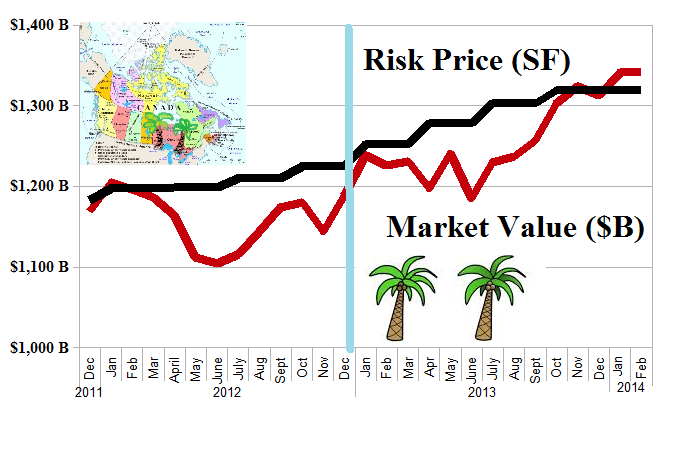 For example, the current entire market value of the resource companies, including the pipelines, is $450 billion and patient money can buy a substantial or controlling interest in all of them for less than $200 billion and there are lots of patient, long-horizon investors in the Canadian pension plans who don’t need to chase our money in Brazil, Argentina, Turkey and elsewhere in the years to come (CBC, January 31, 2014, Head of CPP fund investing ‘where the puck is going to be’).