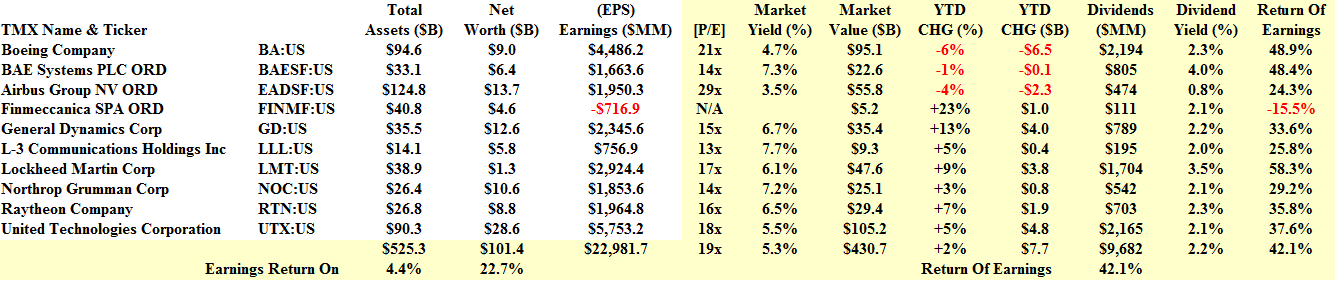 The defence contractors earned $23 billion last year and returned 42% of it or $9.6 billion to the shareholders for an aggregate dividend yield of 2.2%.