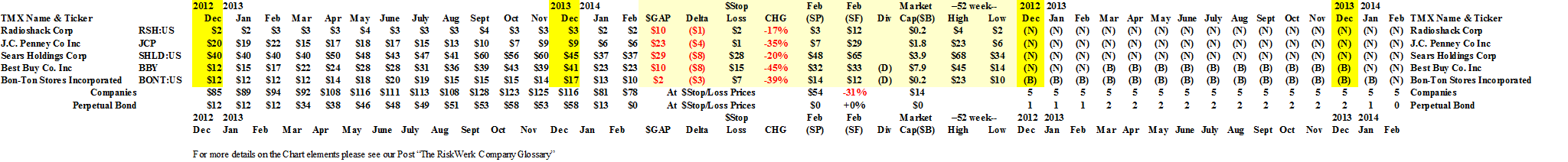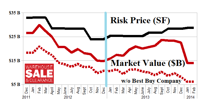 The current market price for all five of the stores – and a lot of employees, customers, debt, inventory and real estate – is $14 billion and that’s only 1/2 of the price of risk ($28 billion). We’ve included Best Buy Company Incorporated but the jury is still out on that (Business Wire, January 17, 2014, Investor Alert: Best Buy Co., Inc. Investigation Announced by Holzer & Holzer, LLC). Please see Exhibit 1 below for the scary fundamentals.