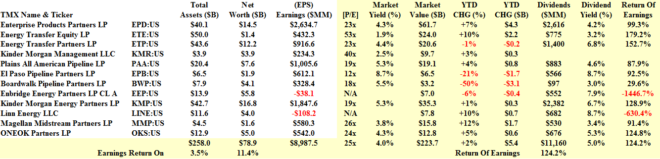 Nevertheless, the industry paid $11 billion in dividends last year for an aggregate dividend yield of 5% and an extraordinary return of earnings of 124%. Moreover, the price yield of 4% seems to run in lock-step with the dividend yield and might explain what happened to Boardwalk and El Paso Pipeline Partners this month. Please see Exhibit 1 below for the fundamentals.