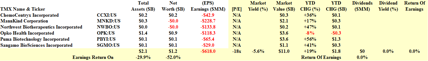 It would easy for a normal investor to miss these stocks; the aggregate market value is only $11 billion – they are “micro-caps” – and the net worth is about half of their total assets – they can barely get debt financing – and their losses were without exception and totalled $618 million last year; and they don’t pay dividends.