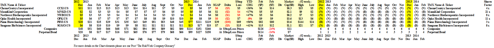 To find the love, we looked at it from our point of view and, interestingly enough, we found that a portfolio of six of these so-called “breakout” stocks found with a ruler and compass and selected at random from the dozens that show up every day but managed as a Perpetual Bond™, is up +82% so far this year and up a staggering +272% since December 2012, a year ago. That bears some watching because we don’t believe in “riskless love”. Please see the fundamentals below.