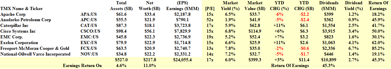 In aggregate, the companies earned $24 billion last year for a return on the shareholders equity of 11% (which is a “banking rate” but these are difficult times) and they paid $10.9 billion in dividends for a return of earnings of 45% and dividend yield of 2.7% which effort is not exactly kibble but the aggregate market value is up only $20 billion and +5% last year.