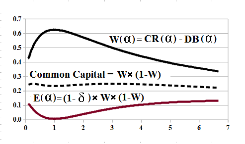 The quantity E(α)=(1-δ)×W×(1-W) (with “α” implicit including 1=1(α)) is then the projection of the “common capital” W×(1-W)≈0.25 (please see Figure 6 on the right) which we call the “common capital” because it is “the” amount of money that is deemed to be equally available to the firm or its trading connections as the “working capital loan” without any security (collateral) such as we would require in the bond debt (B).