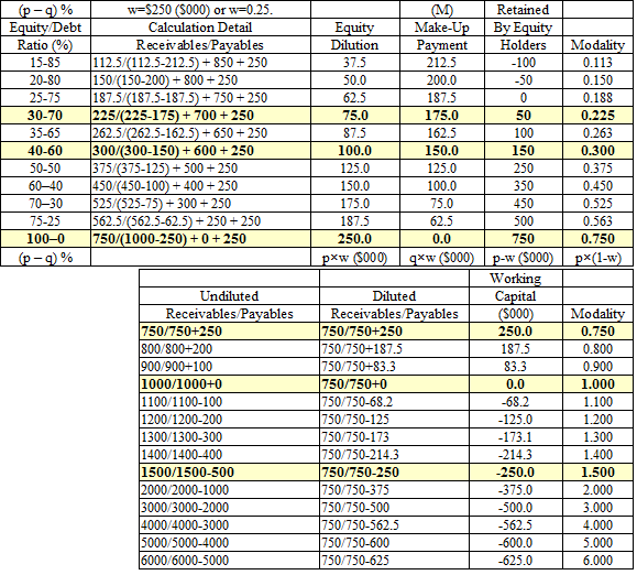 The “bond debt” (B) is typically regarded as secured by the fixed assets and possibly the inventory (“what the company owns”) whereas the “working capital loan” (W) is a “bank loan” and is regarded as secured by the good faith of the equity owners who will likely pay it back if the firm falters and they intend to do business another day; please see Figure 5 on the right which develops the table of modalities for various financing levels assuming always that the working capital loan is 25% of the capital; the table changes under other assumptions but, as we shall see in the development of the Coase Dividend, the value 25% or 0.25 is virtually mandated by the development of the “float space” in the trading connections; in other words, if we have $100 million in financing by bond debt and equity, we should expect to get $25 million in a line of credit by noon at any bank.