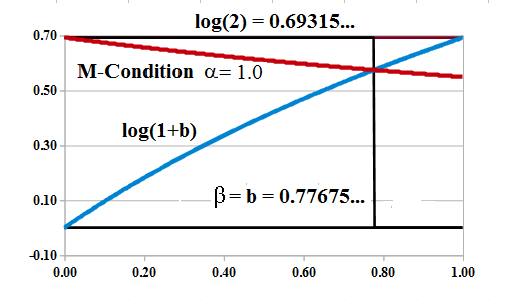 With reference to Figure 2 on the right with modality α=1, it doesn’t seem like too much to ask that we can find such (b); the “blue line” is log(1+b), 0≤b≤1, and it is always the same for all 0<α<+∞ and monotonic increasing from zero to log(2)=0.69315….; the “red line” is (1/(1+b)^α)×log(1+(1+b)^α)) for the same 0≤b≤1 and it is monotonic decreasing from the value log(2) at b=0 to (1/2^α)×log(1+2^α) at b=1; therefore, all that we would have to show to prove the possible existence of such b=p((b)) is that (1/2^α)×log(1+2^α)<log(2) for all 0<α<+∞ because that would mean that the “red line” always starts above the “blue line” and always ends below it.