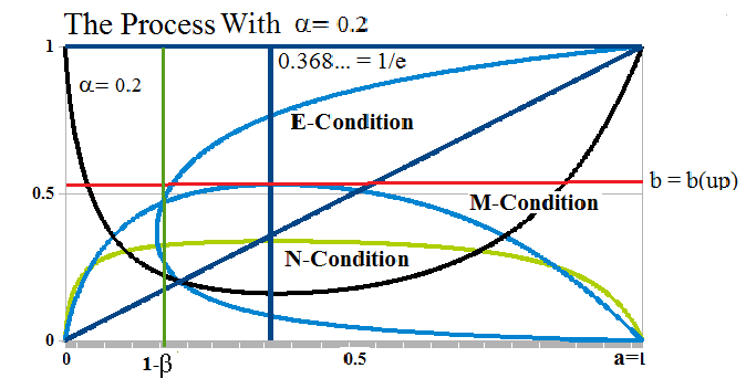 On the other hand, Arc(β,1)→0 as α→+∞ because β=β(α)→1 and both b→1 and Arc(0,1)→1 but Arc(β,1)→2 (not 3) as α→0; that is Arc(β=0,1)=2≠3=Arc(0,1) and the implication is that although a=0 is possible at the “start-of-process” for any α>0, β is formed in-process and can never be zero; please see Figure 4 above for α=0.30 and Figure 1 for the correct orientation of β in the process space; to prove this relationship, we know that the line which joins (0,1) to (β,b) with β×log(β) = α×log(b) is always inside the 1st E-condition (because it’s convex) and can therefore never be a part of Arc(β,1) in contrast to Arc(0,1) which tends to 3 and includes or “absorbs” the line as α→0.