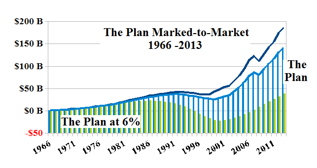 The last time that the plan was in trouble was in 1983 through 1999 in which every year for fifteen years there was a negative cash flow that aggregated to a deficiency of $52 billion for the plan which then had assets of between $26 billion in 1983 and $43 billion in 1999 when it paid-out 7% of its assets but between 10% and 16% of its assets for each of the seven years previous to that (1992 through 1998); please see Figure 4 on the right in which the realized investment returns of the time are accumulated with the positive and negative cash flows of the time and fall short of the “marked-to-market” paper profits by $50 billion in 2013 and which paper profits they might not be able to pull-down when they need them (and that is already in evidence), as was the case in the “liquidity crisis” that affected the banks in 2008 and 2009 and which was ended by a multi-trillion dollar bail-out by the government that is still going on today and has rattled both the bond and stock markets world-wide.