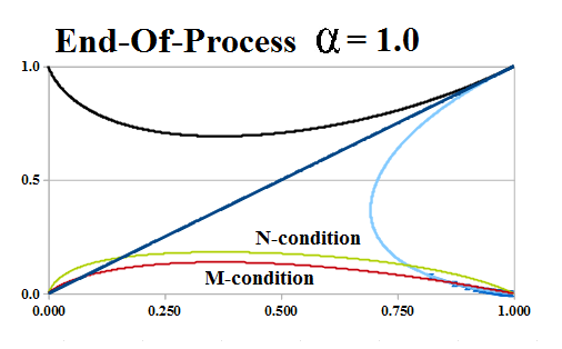 Although it’s natural to think of the production as beginning at (0,1) and ending at (1,1), as in Figure 1, this analysis suggests that what actually happens is that the process emerges from the “death embrace” of Company D, at α=1/e, with a=b=1/e, and then moves on to either never-ending “production” at (1,1), or “receivership” at (0,1); that view is also supported by the Theory of Firm in which new companies are financed in the “N/B/W”-financing model as “40/60/25”, and the modality is α= 0.40 × (1-0.25) = 0.30.