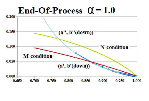 Figure 3.1 shows the “global picture” of the two E-conditions for α=1.0, and Figure 3.2 shows the “corner” at (1,0), or a=1 and b=0, with the “blue dots” showing the progress of a'(right) to 1 and b(down) to zero; Figure 3.3 is the same as Figure 3.2, but stated in capitalization terms as log(1/a). Moreover, the relations that are shown always obtain for any α, because both the M-condition and the N-condition are convex-down, and the 2nd E-condition (shown in “blue”) is convex-up near (1,0), and the difference for the same (a) and (b) is (1/(b^α))×log(1+b^α) + (1/(b^α))×log(1-b^α) = (1/(b^α))×log((1+b^α)×(1-b^α)) = (1/(b^α))×log(1-(b^α)^2) <0 for any b>0 and any α>0; hence, for any b(down)→0, the corresponding a’ on the M-condition and a” on the N-condition, are such that a”<a'<1, and the capitalization rates are log(1/a’)<log(1/a”), as shown on Figure 3.3.