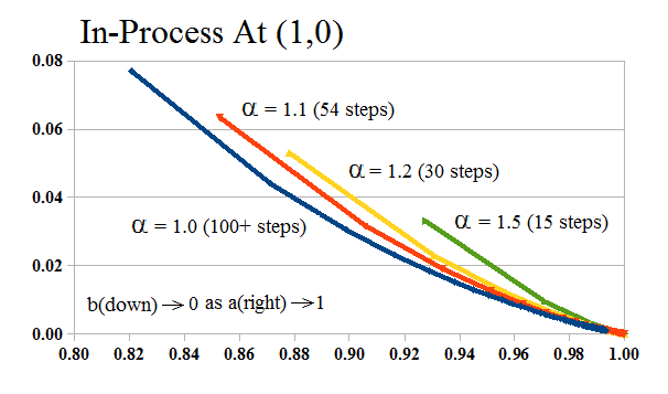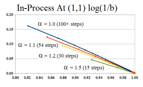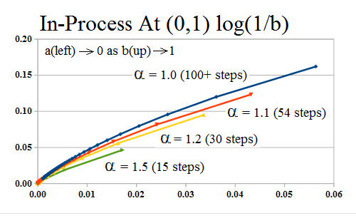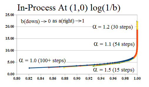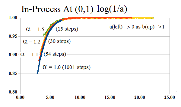 However, nothing seems to be happening in most of the charts, but Figure 5 and Figure 10 look like “explosions”, and they are the number of “steps” that are required to get within a close tolerance of the end-of-process at (1,1), and that number decreases rapidly as the modality increases even slightly from α=1 to α=1.1, 1.2, and 1.5, in the natural co-ordinates of the process (Figure 5), and of the trading connections (Figure 11), but, thereafter, an “infinite” number of steps are required in each case in order to increase even further, and in all of that “time”, we’ve barely moved the needle, from a=1/e to a=10^-6 (1/millions) in so many steps, and then to 10^-9 (1/billions), and 10^-12 (1/trillions), and so forth, in orders of magnitude more.