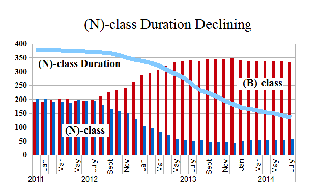 Thereafter, the number of companies that spend all of their time in the (N)-class and none of their time in the (B)-class is declining as more (N)-class companies are “promoted” to the (B)-class for at least some of the time; the right-hand side of the chart indicates 135 companies which are never (N)-class and always (B)-class during the entire interval of 32 months; for more details, please see the link above.
