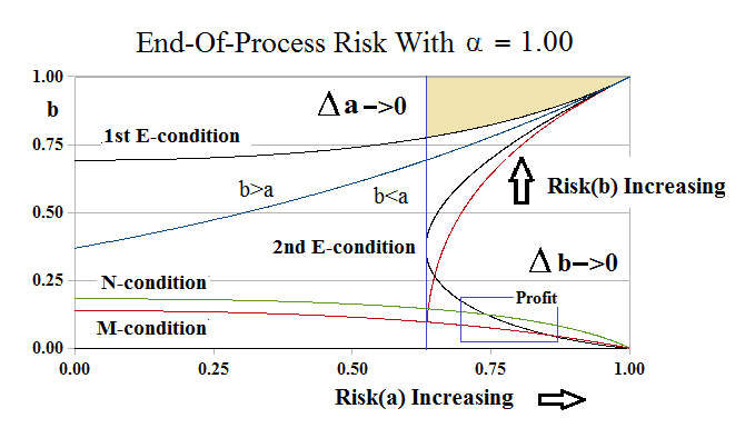 The M-condition defines the in-process set, (a), as occurring with probability, a=p((a)), such that Risk(a) = 1 + log(a) = lim (1/b^α)×log(1+b^α) as b→1 and Δb→0, in which an “excess” of receivables (Δb) is developed in the trading connections in order to effect the exchange at a=b=1, which is the end-of-process, although it never gets there in-process.