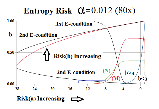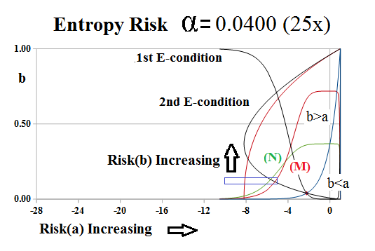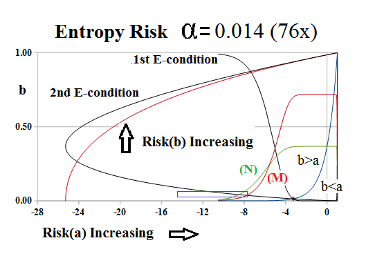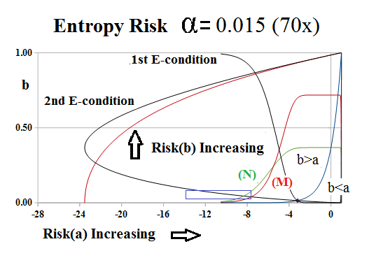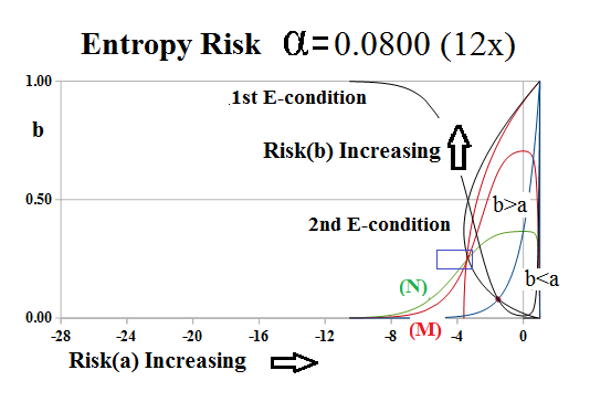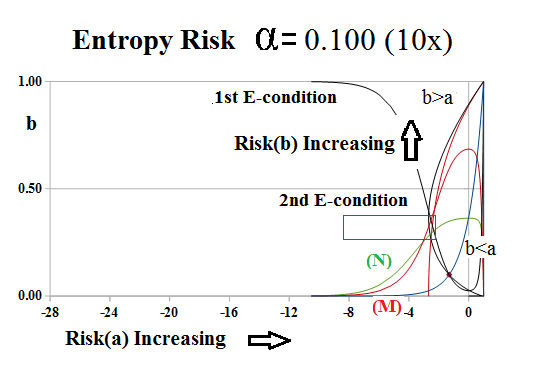 The chart on the right, Figure 3, shows the one-step behaviour of the risk entropy near α=0, as the “blue box” defined by the 2nd E-condition and the M- and N-condtions, shrinks or expands as α→0.