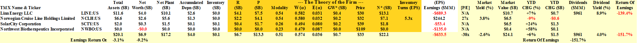 There are, however, a few Company A’s in the S&P 500 NYSE (9 companies), the NASDAQ (4 companies), and the S&P TSX (27 companies) with an aggregate debt of $215 billion, which is less than 4% of the Dow debt, and these companies are also “winding up”, upwards aggressively, because their current net worth ($113 billion) is only a third of their intrinsic net worth (N*) at $324 billion; please see Exhibit 1 below for a summary and click on the links above for examples of Company A which, in general, could be a “company” or a government or a whole economy, and the only requirement is that they demonstrate a modality α, 0<α<1/e = 0.368… .