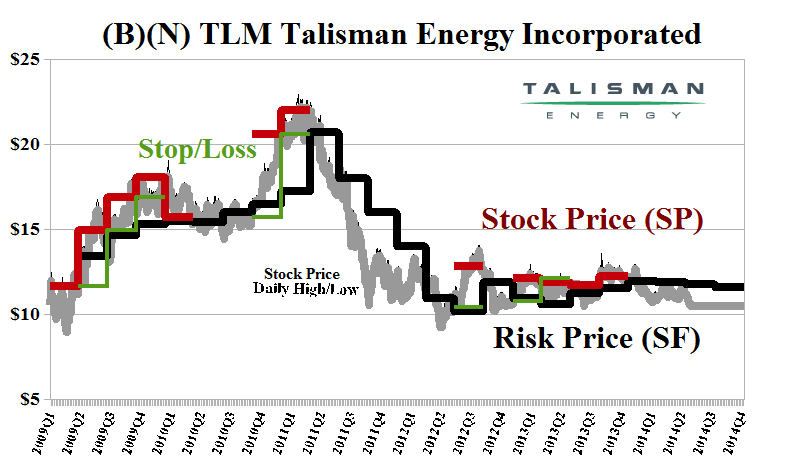 We’re don’t know how this will work out; there are a lot of hurdles and Talisman is primarily a natural gas producer in Canada, and Repsol would prefer more oil in familiar locales; the company is not currently in The Perpetual Bond™ because it’s been trading below the price of risk, which we estimate as $12, and it has a downside in the price volatility of minus ($1) off $11 in the next quarter; please see Exhibit 1 below for more details.