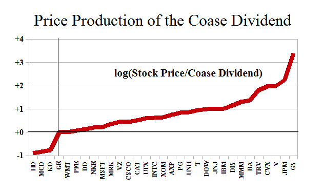 For example, the Coase Dividend of the General Electric Company is $10 billion for which the market is willing to pay – by demonstration – $26.57 for $1 of the Coase Dividend which calculates the “balance sheet worth of the trading connections” and, therefore, the balance sheet worth of the company’s enterprise, which has to do with producing and selling their products, day-in and day-out, regardless of the stock price.