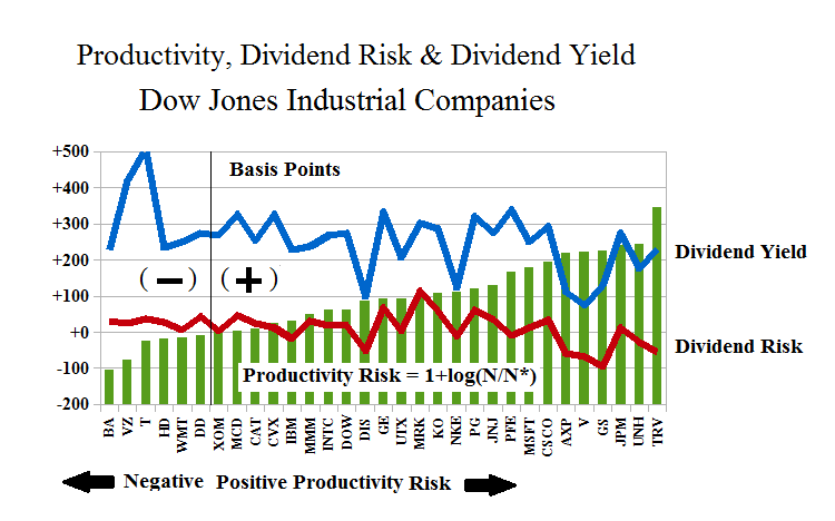 Both the Dividend Yield (blue line) and the Dividend Risk (red line) are drifting downwards as the Productivity Risk (green) is increasing; however, the chart suggests that the Walt Disney Company (DIS), Nike (NKE), American Express (AXP), Visa (V), and Goldman Sachs (GS), are all “overvalued” (on the right, in this case, because of the change in orientation) and likely to attract price declines and, hence, they suggest that we buy “put options” as a defence; on the other hand, Verizon (VZ) and AT&T (T), on the left, are grossly “undervalued” by the same standards, and suggest a “call option”.