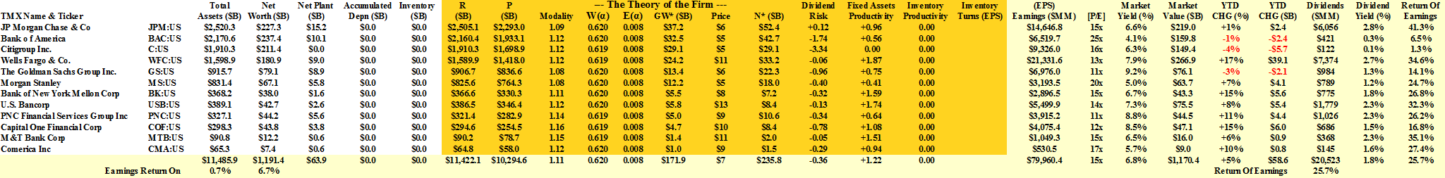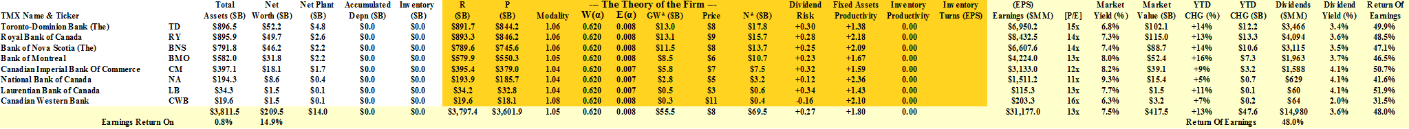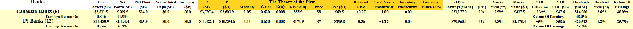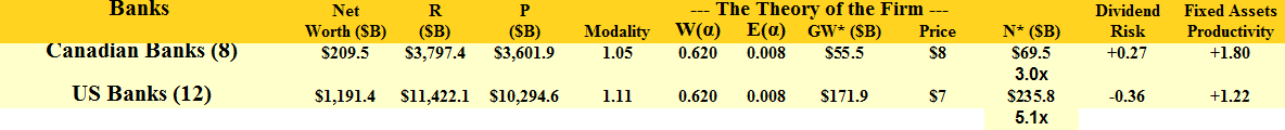But that raises some concerns because if the actual modality – the “private modality” – is the same as “by the books”, then the US banks should be more profitable than they are; that is, their “Dividend Risk” should be higher; and their “Fixed Asset Productivity” should be higher; and their return on the shareholder’s equity, should be higher (noted above as 7% for the US banks and 15% for the Canadian banks); and (N*) should not have to “work” so hard (3× for the Canadian banks, and 5× for the US banks) to “support” the shareholders equity; please see Exhibit 2 above, and our recent Post, “(P&I) Productivity“, for more information on how “risk” and “productivity” are defined and measured.