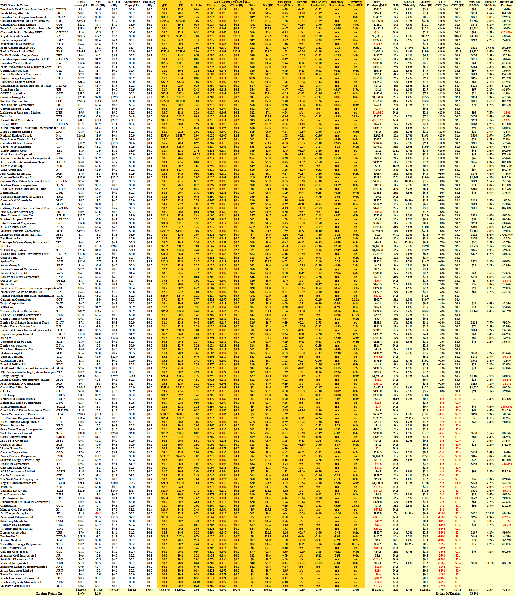 They also lost a lot of money last year ($13 billion) but they also made a lot of money ($46 billion) in aggregate, for a net gain of $33 billion, and they returned 60% of their earnings, and an aggregate dividend pay-out of $19.7 billion, which gave the investors an aggregate dividend yield of 2%; please click on the links (and again to make them larger if required) “(B)(N) The Canadian Hot Money Stocks Winners – Cash Flow, Portfolio, and Fundamentals” for the details.