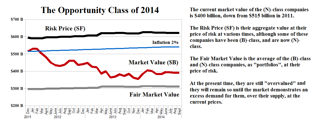 In contrast, the performance of the (N)-class companies – trading below the price of risk – in that same portfolio of companies with stock prices that have increased by more than 16% this year (Figure 1.1 above), were not in our portfolio all of the time, only some of it, and that portfolio is down minus (-54%), because some of those companies migrated into the (B)-class, and we knew enough to buy them when they did, but not enough to buy them in the (N)-class, for which the prices are lower, but indeterminate, volatile, and we don’t know the downside – hence, they are not qualified for safe, liquid, and hopeful; there are still 36 companies in that class (122 less 86).