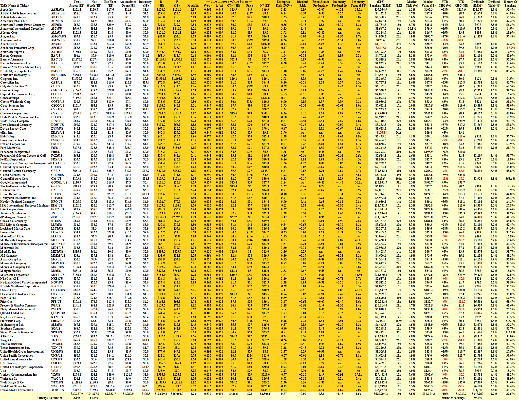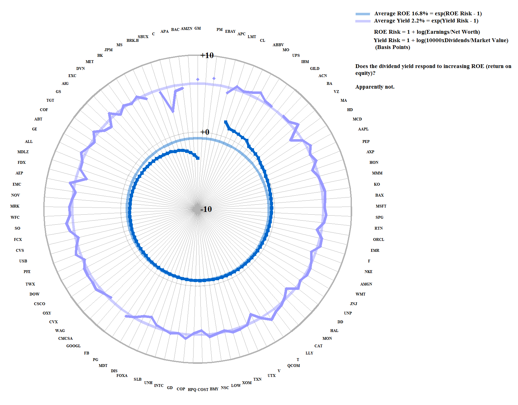 The “gaps” belong to companies that don’t pay dividends, including Amazon, eBay and Berkshire Hathaway, for example, and the extreme points are General Motors (over 360% of its earnings) and Starbucks (340% of its earnings), for example, or Citigroup (only 1.3% of its earnings); please click on the link (and again to make it larger if required) “S&P 100 Fundamentals” for additional details.