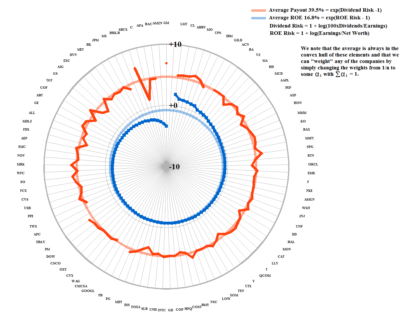 In Figure 1.2, we have restated the ROE as Risk ROE=1+log(Earnings/Net Worth) (blue line) and “correlated” that with the Dividend Payout Risk =1+log(Dividends/Earnings) (orange line); the “faded” orange line is the average, 39.5%, return of earnings to the shareholders, and we can see that there is no exceptional reason for excluding very many, if any, of the companies.