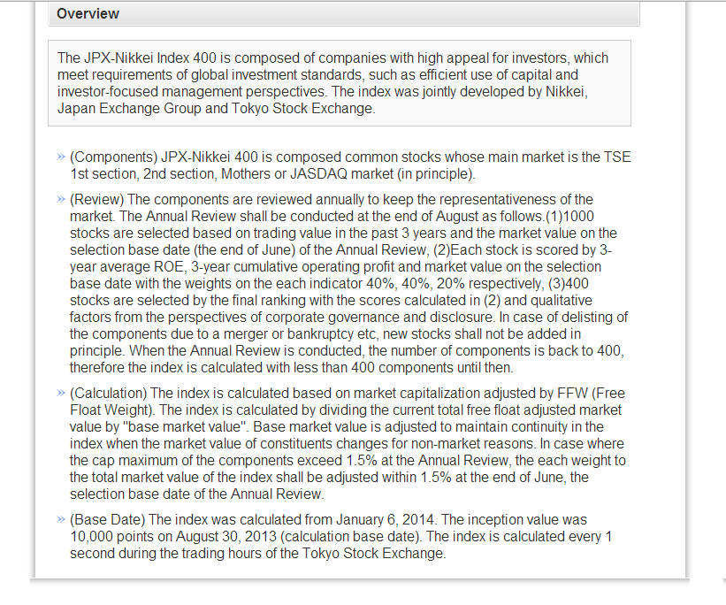 The index (which trades as the JPX-Nikkei Index 400) is limited to 400 select companies, all considered Japanese, which are weighted by market capitalization in the index, but these companies are also graded by measures of “capital efficiency” – for which Mr. Tanaka uses the return on equity (40%), three years of cumulative operating profit (40%), and the market value (20%) – and those criteria have excluded about 1/3rd of the companies in the Nikkei 225 (NKY) and, recently, dropped the Sony Corporation which failed to make the cut (Bloomberg, July 29, 2014, Sony Seen Reject From Japan Shame Index in Losing Stock Cull).