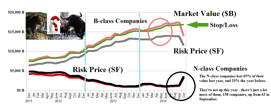 The price of risk is not hard to figure out; it’s always no less for us than the price that we paid for the stock, but the issue is whether we can defend that price with a useful stop/loss or sell-point below the current price – not above it – because we’re not too worried if investors want to pay more for the stocks that we own; absent liquidity needs, we can just raise the stop/loss and sell it to them another day.