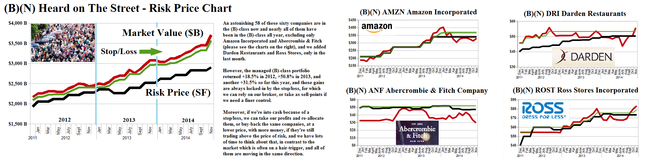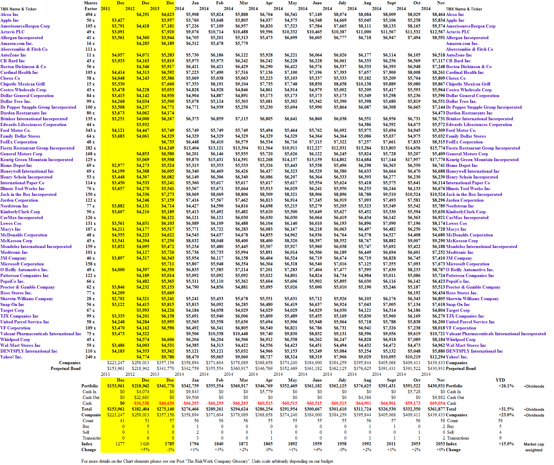 This portfolio also has an excellent track record – it was up +13% in 2012, +25.6% in 2013, and another +20.5% this year, and it earned $166 billion and paid $67.7 billion to its shareholders for a return of earnings of 40.8% and a current dividend yield of 1.8%; please see Exhibit 1 below for the fundamentals and click on the links “(B)(N) Heard on The Street – Prices & Portfolio and Cash Flow Summary” for further details.