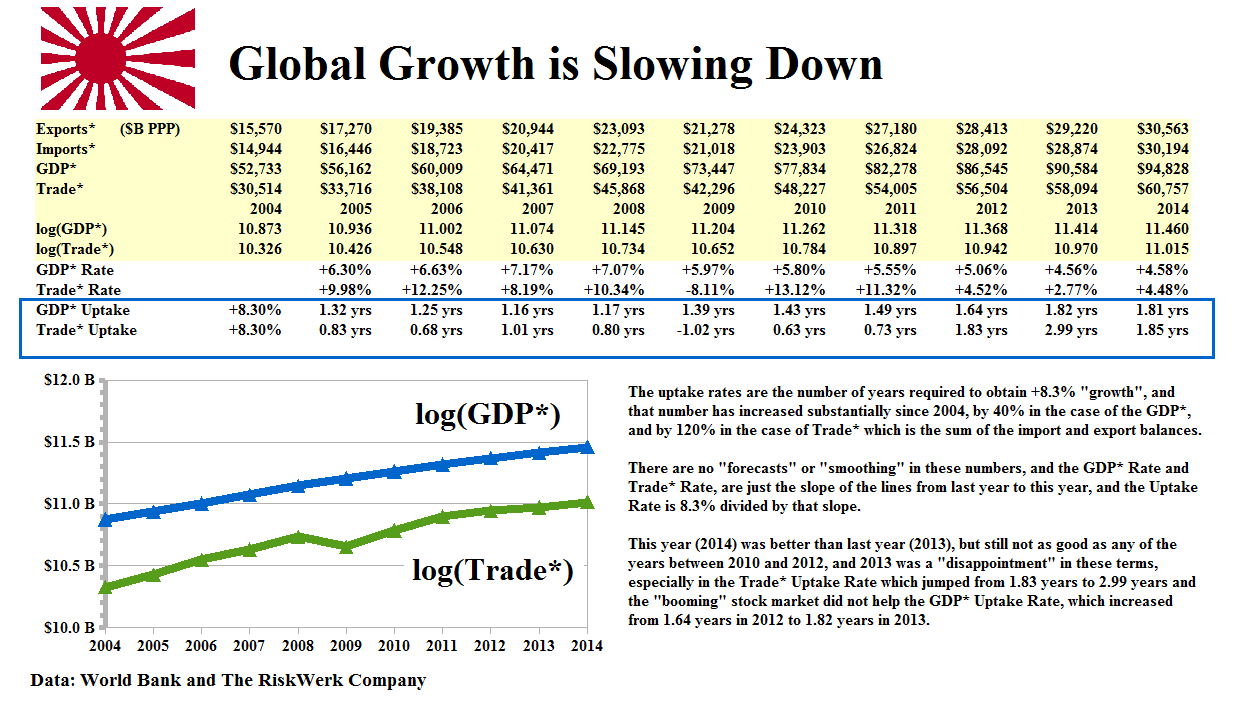As a result, the global trade modality, α = Export*/Import* = 1.164, is almost optimal for the “Profit Box” which occurs with a modality of α≈1.10; we also know that the expected rate of growth (not exactly “inflation”) is 8.3% and we can determine the “take-up” rate in years by simply measuring Export* + Import* over some number of years (which we do in rolling blocks of six years in order to “capitalize” these quantities); please see Exhibit 2 on the left.