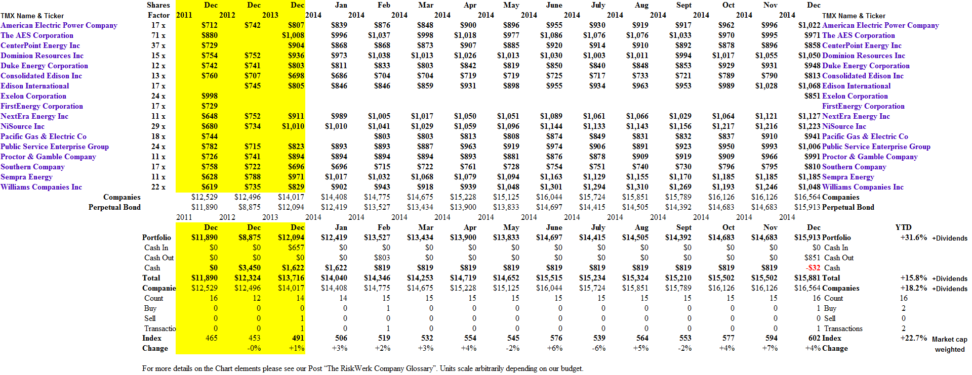 But we’ve had no reason to change our strategy or re-visit the big-cap portfolios of October and most of this year (please see our Post “(B)(N) What’s A Girl To Do“); for example, IBM and Chevron are still trading below the price of risk and the managed (B)-class portfolio is up +20.5% this year, plus a current dividend yield of 2.7%, which will help a lot of incomes if they knew enough to stay around – not to mention the Transports +67% this year, and they only started rolling in 2012; please click on the links “(B)(N) Dow Jones Industrials, Dow Transports, Dow Utilities – Cash Flow Summary” for summary updates.