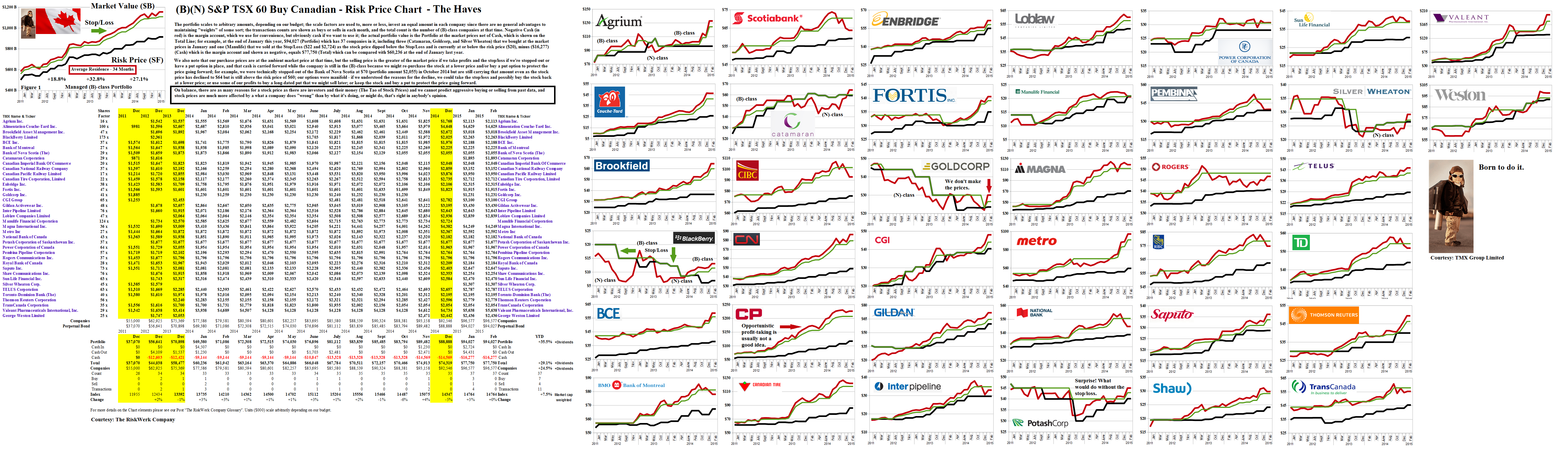 Investing in the stock market is the easiest way to acquire an interest in foreign businesses and we’re willing to hold thirty-seven of the top sixty companies in Canada and that’s down from forty-six last year, but these companies gave us capital gains of +27% in 2013, +25% last year, and are up another +4% so far this year in the managed (B)-class portfolio which never loses money – it’s in our “jeans” and that’s the DNA of it just as some companies are (B)-class and others are not – we’re “stock pickers” and we like the tangibility of dividends and capital gains and liquidity when we need it and don’t like being whipsawed by the latest economic forecasts and short derivative traders who tally the future in basis points.
