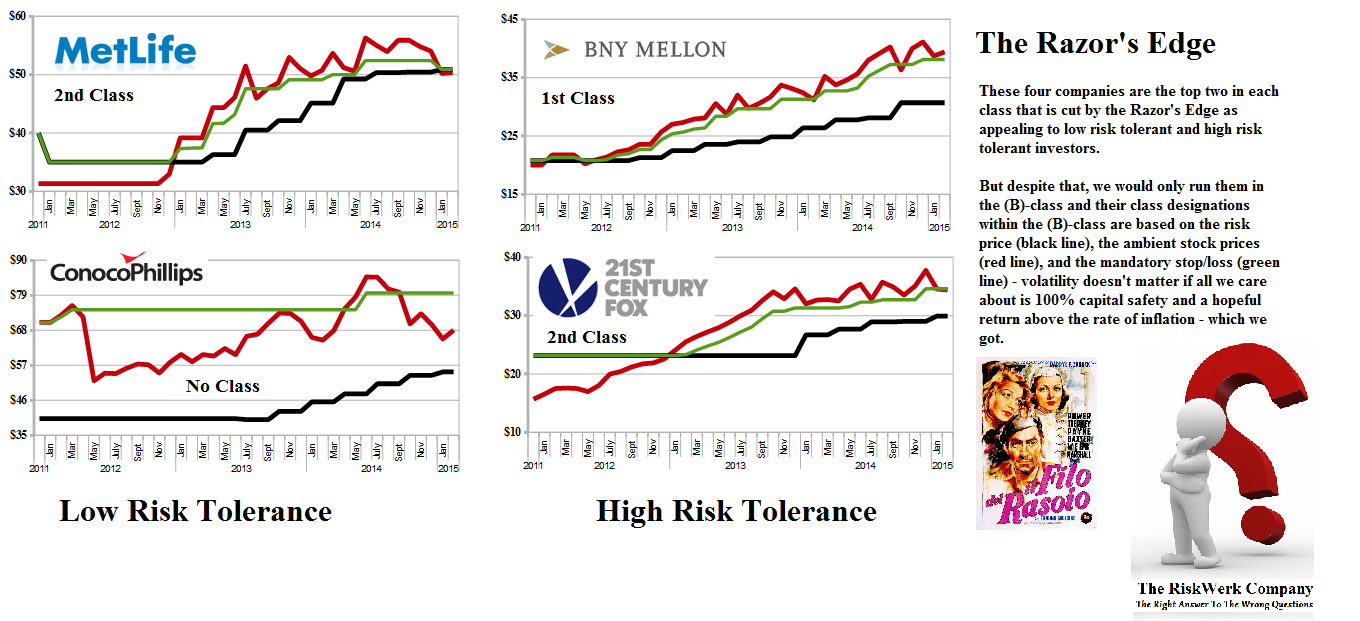 The Razor’s Edge is the market capitalization weighted investor risk tolerance (the Safety Razor, as above, and with the “risk-free rate” also calculated according to the weights assigned by the market capitalization) and we can use it to partition the market into “Lower Risk Tolerance Stocks” with a Safety Razor above the Razor’s Edge and “Higher Risk Tolerance Stocks” with a Safety Razor below the Razor’s Edge (naturally).