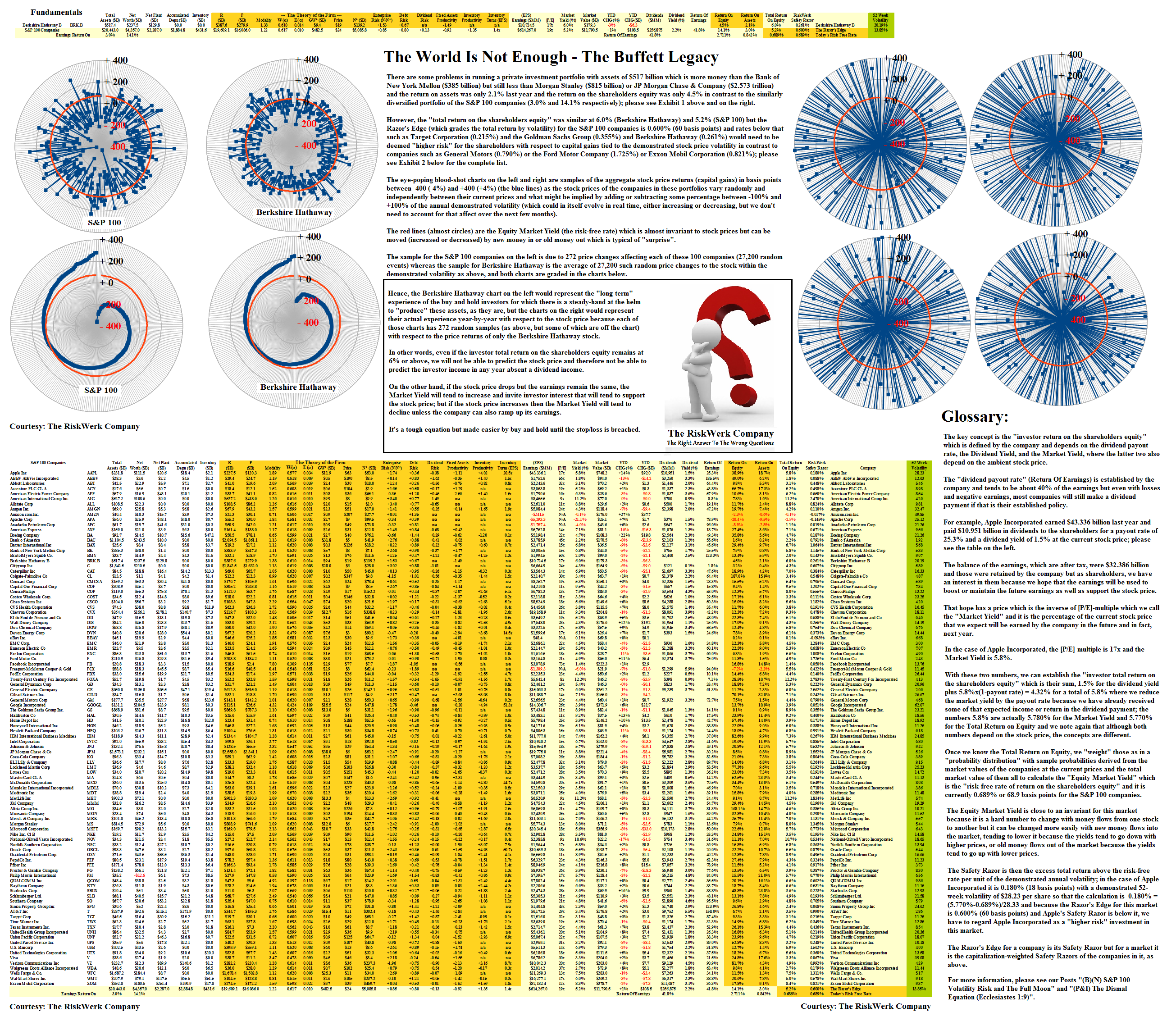 The Berkshire Hathaway stock has an Equity Market Yield of 0.261% (26.1 basis points which is both its Equity Market Yield and its Razor’s Edge because it is the only company in the “portfolio”) and we can compare that to the portfolio of all the S&P 100 companies which has an Equity Market Yield of 0.689% and because their total returns on the shareholders equity are similar at 6.0% and 5.2%, respectively, we can say that our investment in the Berkshire Hathaway stock is more or less “risky” than holding the entire market if the Equity Market Yield (0.261%) is above the Razor’s Edge for the S&P 100 companies (0.600%) – and therefore less “risky” – or below the Razor’s Edge – “riskier” – which it is; please see Exhibit 2 below for more details on the grim reaper and how it can be defeated if liquidity is not an issue.