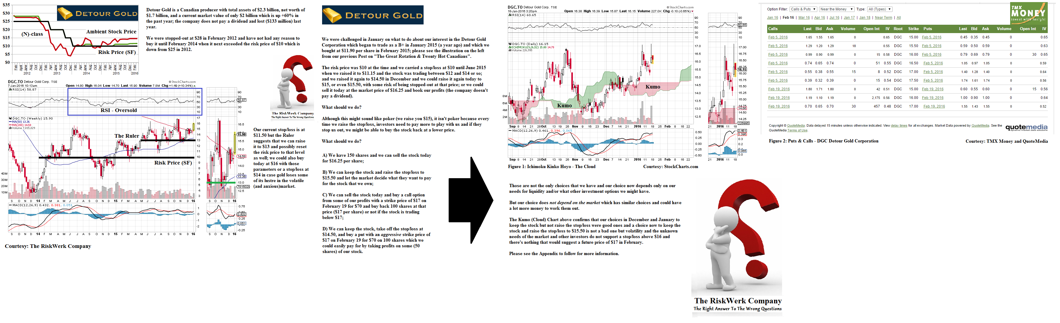 For example, we kept DGC Detour Gold Corporation in our (B)-class portfolio and the price is up +36% since December and (as we projected) we could raise the stop/loss price from $11.50 to $14 and it’s trading today at $16 – but what next? We don’t like gold per se but if they’re giving it away today, what should we do? Please see Exhibit 1 below (and click on it and again to make it larger as required).