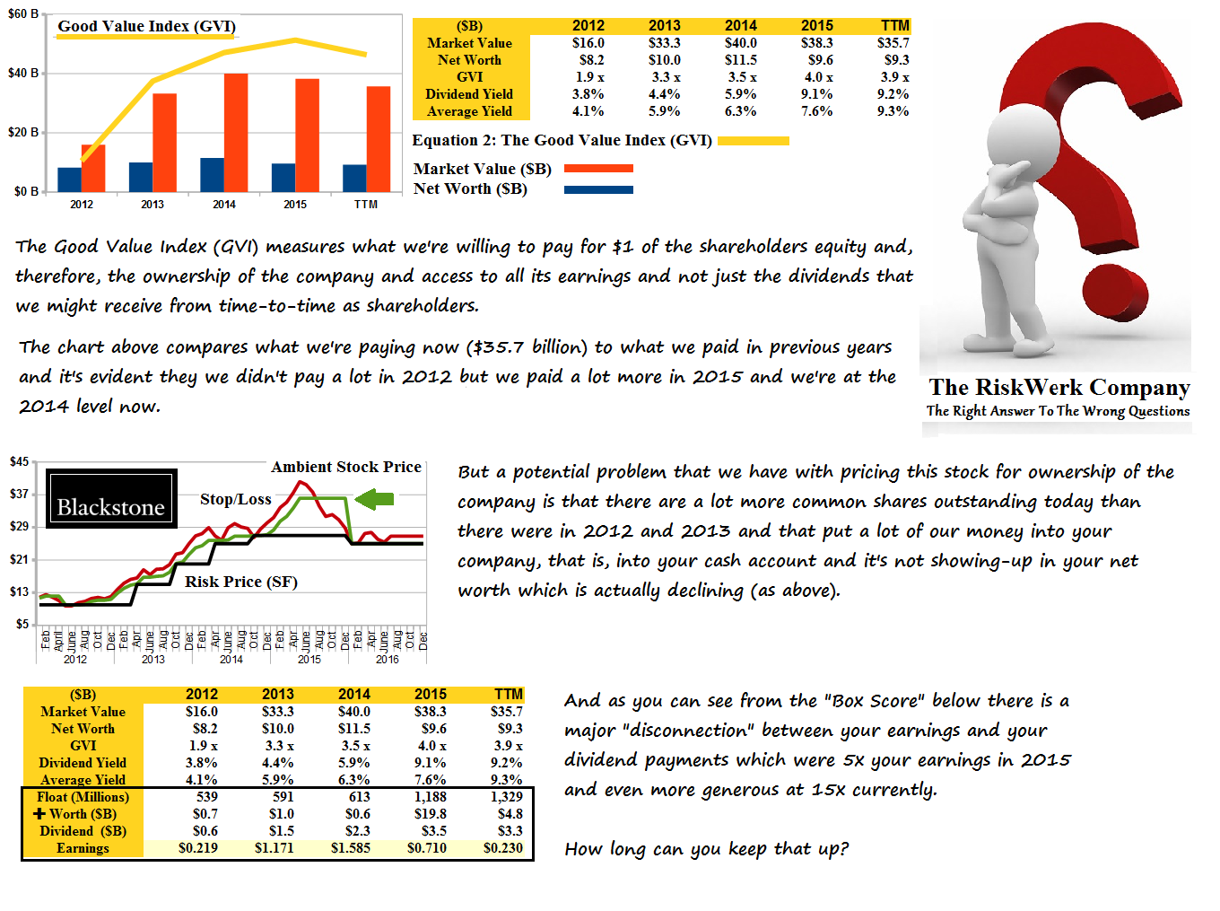 It appears, then, that we’re currently paying way too much for an interest in the earnings of this company and that we’ve already paid for the current dividend yield of 9.2% and a payout of $3.3 billion which is 15x what the company earned last year.