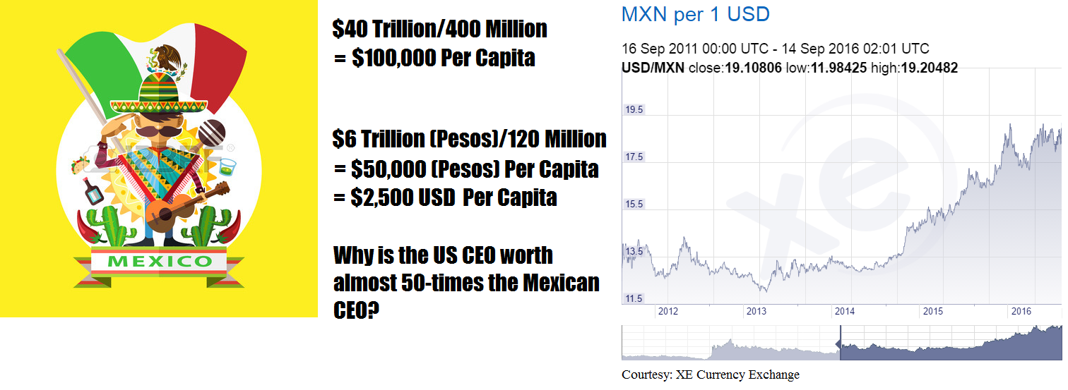 Moreover, the Mexican peso (MXN) traded at about 10 pesos to the dollar a decade ago and so the peso has become a lot cheaper in US dollars, but the peso has not changed that much in terms of how it affects the people and their spending power with a targeted inflation rate of about 3% per year and GDP growth in constant dollars or per capita that is similar to the US and the US dollar has become vastly overvalued and “high priced” as above in the hunt for an “income” on it.