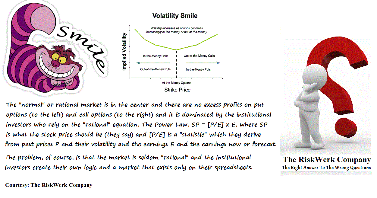 Investors correct for it by developing an “implied volatility” which is calculated from the actual prices for which they can buy and sell these stocks (the underlying) and, therefore, they shoe-horn this market into their “rational market” and assume that these investors will eventually behave “rationally” (like them) or pay a price for their “irrational” behavior; please see Figure 1 on the right.